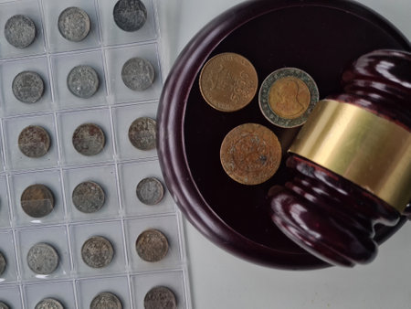 Auctioneers or judges gavel and old coins. Numismatic collection or auction concept and judgment