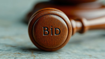 A gavel with the word bid on it sitting next to a table, AI