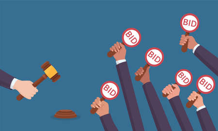 Auction sale buyer competition and legal finance trade. Human competitor hand holding paddle plate with bid text and auctioneer hammer to close deal vector illustration for auction and bidding design