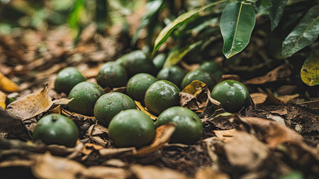 A close-up of macadamia nuts still in their green husks, freshly harvested and scattered on a forest floor surrounded by leaves.