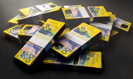 A pile of randomly scattered bundles of australian dollar banknotes on an isolated background - 3D render