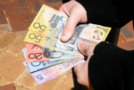 Hands holding australian dollars 50 banknotes. Finance help and payment concept