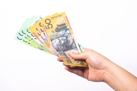 Close up fifty Australia Dollar money bills in hand isolated on white background. Hand holding or giving money in financial and economy concepts.