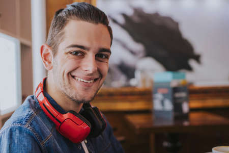 A young man in headphones listening to music and looking enjoyed