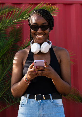 Vertical portrait of a cheerful young African American woman using her smartphone.