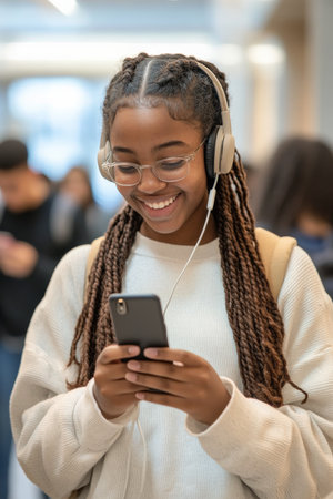 An African American female student, with her hair styled in braids, is using her smartphone in the hallway. Her headphones are on, and She is smiling widely as she reads a message, with students moving around her in the background.