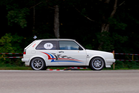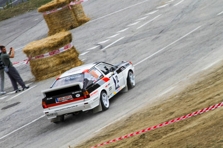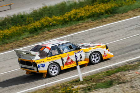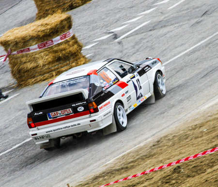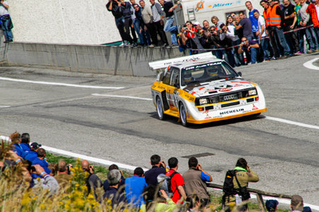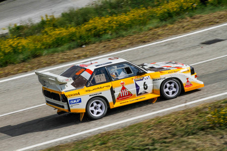 San Marino: 2010 09 01 Rally free event Classic Audi Quattro Rally Group B Car Speeding Uphill Action. High quality photo