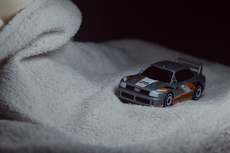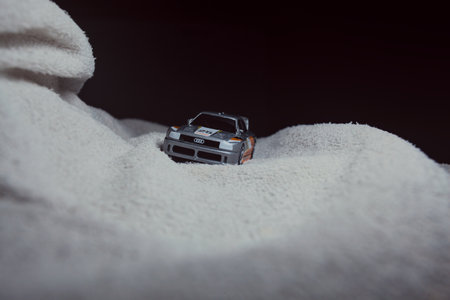 Mantua, Italy - 10TH JANUARY 2025 - Hot Wheels replica of a 1984 Audi Sport Quattro in rally livery and trim pretending to run a rally on a snowy road, next to a cliff, in the mountains