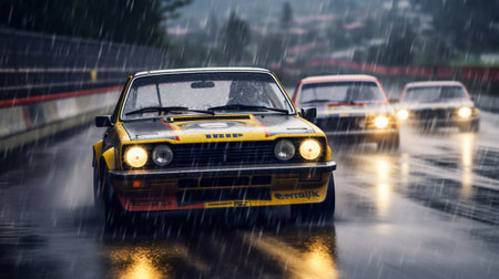 Rally Car Crossing the Finish Line in the Rain. Generative AI. high quality illustration