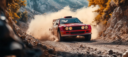 A rally car navigates a dirt trail in a dense forest, kicking up clouds of dust. The image captures the speed and intensity of the race. Concept of adventure and motorsport