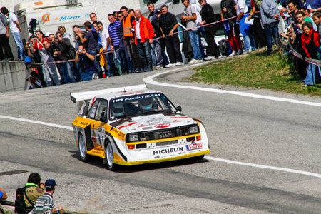 San Marino: 2010 09 01 Rally free event Audi Sport Quattro Rally Car Amidst Spectators. High quality photo
