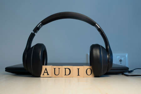 The word audio is written. Computer and headset in the background. music concept
