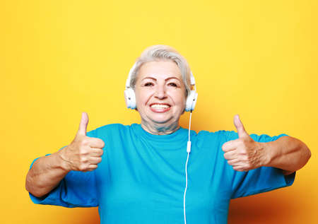 Elderly woman listening to music and show thumbs up over yellow background.