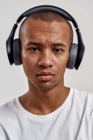 Closeup portrait of serious mixed race guy wearing headphones looking at camera, listening to music or podcast while posing isolated over white background