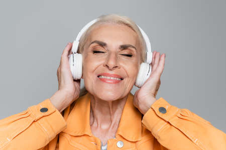 overjoyed senior woman touching headphones while listening music with closed eyes isolated on gray