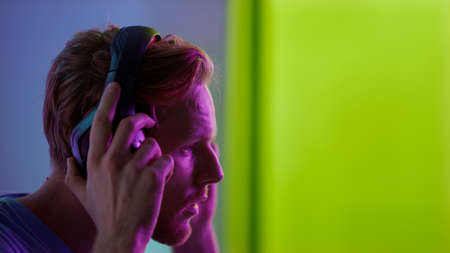 Neon guy putting headphones at cyberspace room closeup. Focused ginger guy esport blogger playing computer game talking team on weekend night. Serious millennial gamer enjoying virtual competition.