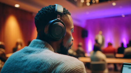 A close-up side view of a Black man wearing large headphones attentively listening during a professional conference or seminar with blurred presenter in background.