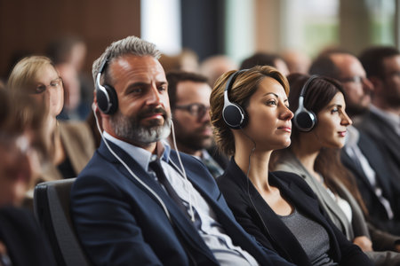 Unrecognizable people using in ear headphones for translation during event