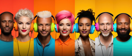 Collage Of Portraits Of Young People In Headphones Isolated Over Multicolored