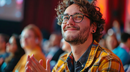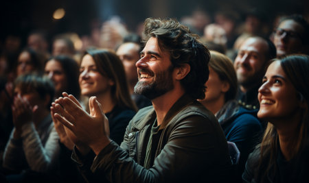 Happy audience applauding at a show or business seminar,theater performance listening and clapping at conference and presentation.Group of supporters,fans cheering excited applauding closeup