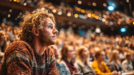 Young Man With Glasses Looking Up During A Lecture In A Crowded Auditorium
