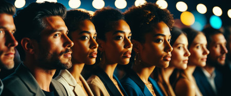 Closeup of theater audience faces bathed in stage light capturing genuine laughter during a captivating premiere night performance.
