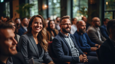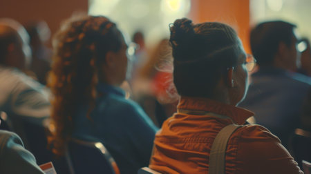 A diverse group of individuals attentively listening to a speaker in a lecture hall filled with rows of seats, An auditorium full of people attending a finance seminar, AI Generated