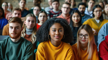 A diverse group of college students engaged in a lecture in a university classroom. Concept Education, College Life, Classroom Environment, Diversity, Student Engagement
