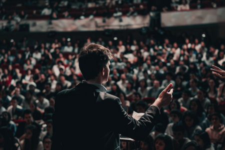 A speaker addresses a packed auditorium, captivating the audience with a compelling message.