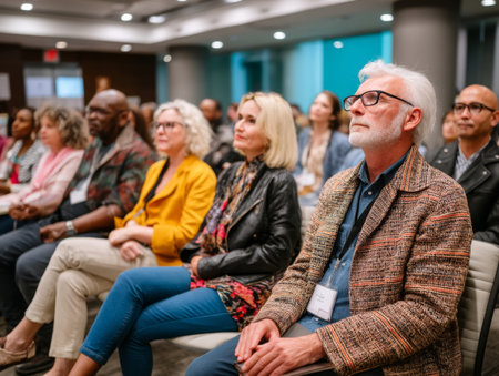 Group of older and middle-aged professionals seated in rows listening to a business presentation during a seminar. Focus is on attentive expressions and body language.