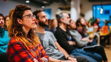 Focused participants in a casual modern setting listening attentively to a speaker during a collaborative educational or motivational event.