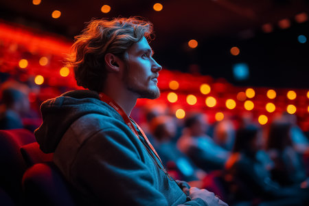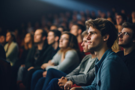 A group of people sitting in a theater, engrossed in watching something. This image can be used to depict the experience of watching a live performance or a movie in a theater setting.