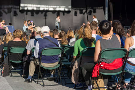Rear view of audience at open air theatre in city center. Tourists enjoying free entertainment.