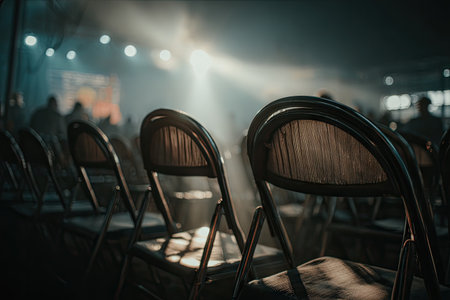 This image captures empty rows of chairs in a modern space filled with dramatic lighting, creating an inviting atmosphere, perfect for events and gatherings.