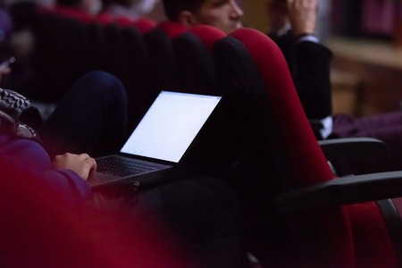 Business people hands typing on laptop computer keyboard during the seminar at conference room