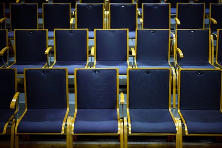 Numbered empty audience seats made of wood and blue upholstery for a theatre or concert event, selected focus, narrow depth of field