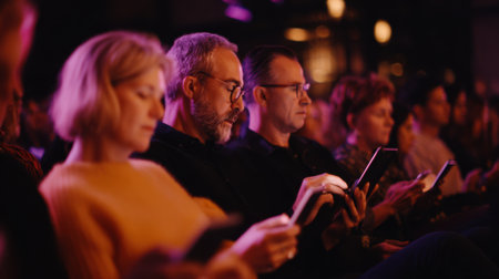 Medium shot of participants using digital devices to engage in realtime polls and QA during a combined physical and virtual business event.
