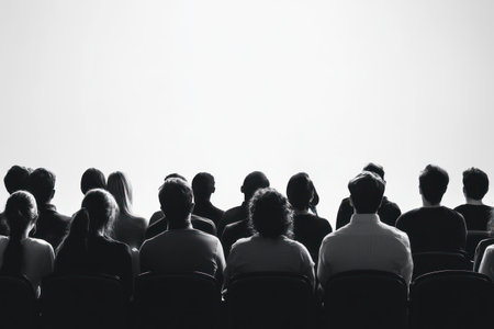 Wide view of seated silhouettes watching a presentation, symbolizing learning, collaboration, and professional or educational events.