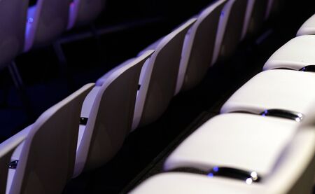 Empty cinema hall with a lot of beige armchairs, dim light