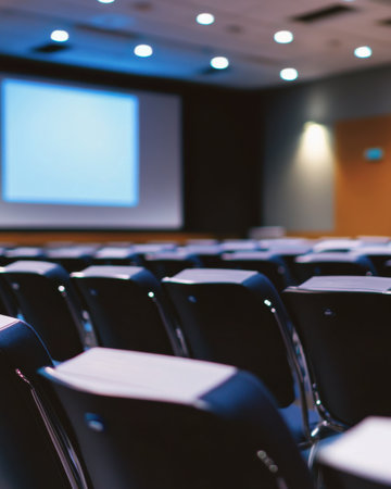an auditorium filled with empty lecture chairs, created with generative ai