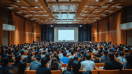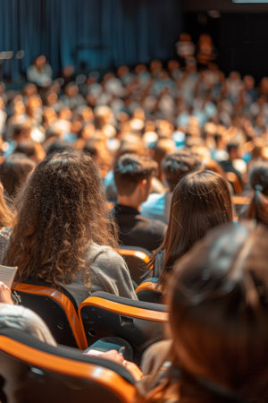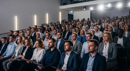 A diverse group of individuals attentively listening to a speaker in a lecture hall filled with rows of seats, An auditorium full of people attending a finance seminar, AI Generated