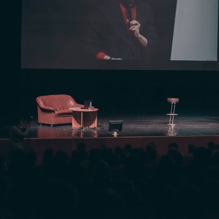 Audience at the modern conference hall listens to panel discussion, people on a congress event together listen to speaker on stage at convention, business seminar, large venue for forum presentation