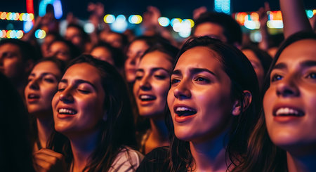 A striking image of passionate vocalists performing in harmony, showcasing emotion and connection, illuminated by stage lights, capturing the essence of live music and community spirit.