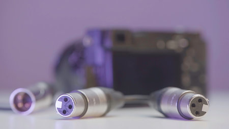 Close-up of microphone wires. Action. Cables with XLR connector for connecting microphones. Cables for connecting microphones to camera. Professional sound recorders