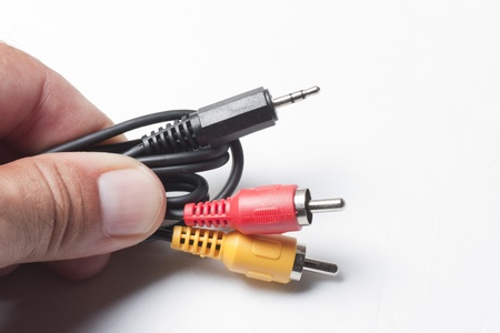 Audio video cable RCA jack in a mans hands on a white background.