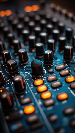 An audio mixer with its knobs and sliders meticulously adjusted, embodying precision and control in the art of sound engineering and music production