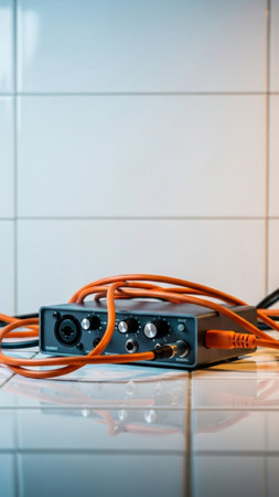 A compact, professional-grade audio interface is the centerpiece of a high-contrast, vertical 9:16 p