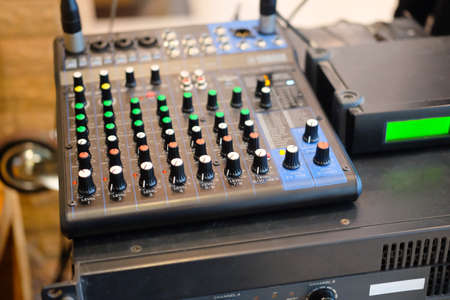 Music equipment closeup. Management console sound design at the event. Big black mixer with control knobs.