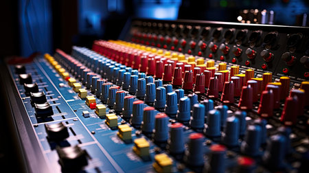 Professional audio mixer console with black knobs to equalize sounds. Audio recording studio tool. Music and entertainment concept