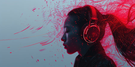 An overhead view reveals headphones positioned above a stylized sound wave graphic. The composition uses contrasting blue and red vertical lines against a dark backdrop. The visual characteristics suggest a digital or technological aesthetic. This image might be suitable for promotional materials, educational content, or design projects related to audio or music.